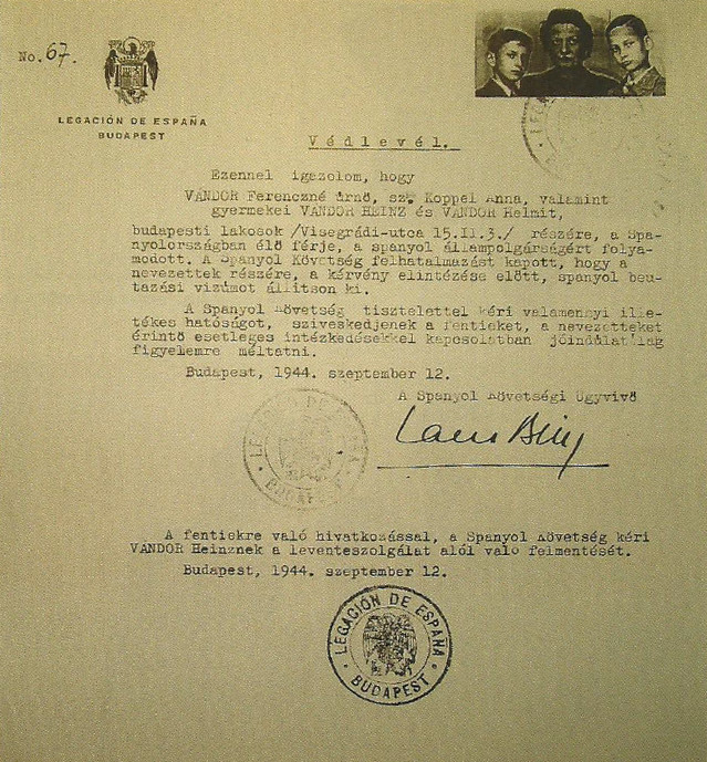 Carta de protección para la señora de Ferencz Vándor (Anna Koppel),madre de Jaime Vándor, y sus dos hijos, firmada por el encargado de Negociosde la Legación de España en Budapest, Ángel Sanz Briz, el 12 de septiembre de 1944.