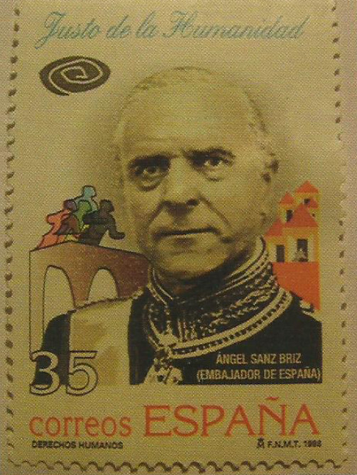 Sello conmemorativo, emitido en diciembre de 1998, con la esfigie de Ángel Sanz Briz, declarado «Justo de la Humanidad»