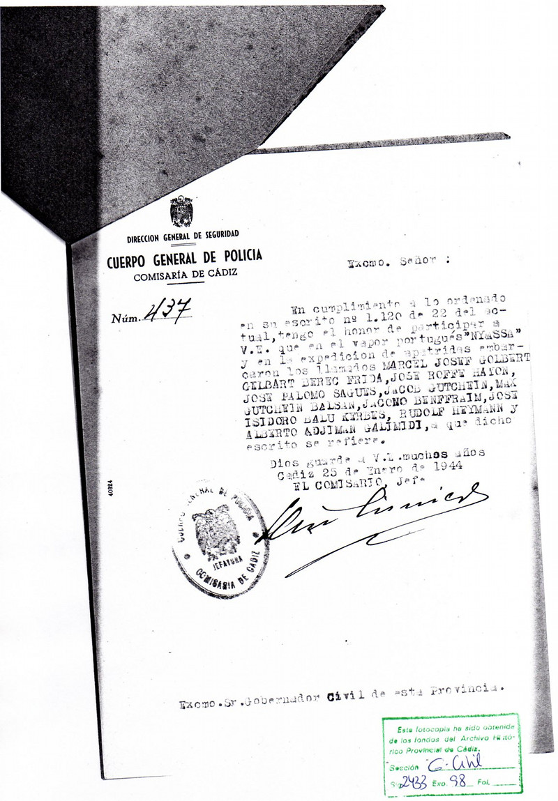El entonces Ministro de Asuntos Exteriores y cuñado de Franco, Ramón Serrano Súñer, firmó con él unos protocolos sobre el intercambio y captura de prisioneros, tanto políticos como Judíos. Una de las consecuencias de esta visita, fue que a estos Sefarditas de Turquía al no haberseles concedido la Nacionalidad plenamente, se les consideró Apátridas. En 1941 la Policía Secreta, se llevó detenidos de madrugada a un grupo entre los que se encontraba José Palomo y su cuñado Alberto Adjiman. Fueron internados en el Campo de Concentración de Miranda de Ebro y su tienda expropiada. Mauricio y su madre aunque no fueron molestados, pasaron dificultades económicas. Durante los tres años que duró el cautiverio, pudo visitar a su padre cuando le llevaban algunas ayudas. Gracias a que varios de los guardianes eran Mallorquines y que José Palomo ya hablaba Catalán, le facilitaron un poco la vida dentro de las durísimas condiciones y el temor a ser enviados a los Campos de Exterminio de Alemania. En 1944, gracias al avance de las Tropas Aliadas, la actitud del Gobierno Español, fue cambiando. Las gestiones de personas como D. Samuel Sequerra, Delegado de la Cruz Roja Portuguesa en España. Pero en realidad destacado miembro de la Comunidad Judía Lusitana y que trabajaba para la JOINT,(Comité Judío Americano de Ayuda). También en las gestiones que hizo ante la Joint, para que la Prensa Americana hablara bien de España, el sucesor de Serrano Súñer, el Conde de Jordana. Todo esto supuso, que se liberaran a estos Judíos Españoles injustamente encarcelados, y que a unos quinientos procedentes de toda Europa, se les concediera salvoconductos para abandonar España a través del puerto de Cádiz. Véase artículo de la Periodista Pilar Vera, en el Diario de Cádiz, del 30 de Agosto de 2009. Moshé Yanai y su familia salieron Deportados en el Nyassa, pero también el barco Guiné, llevó a estos Judíos a Israel, entonces Protectorado Inglés de Palestina. Para Sudamérica salieron otros barcos, como el Cabo de Buena Esperanza, véanse relación de pasajeros en JUDIOS SALIERON DE CADIZ EN 1944. Con el fin difuminarle el recuerdo de su salida de Cádiz, como Deportado, un grupo de amigos acordamos traerle para hacerle un Homenaje. Lo invitamos a él y a su esposa Sara Cohen, pagándoles todos los gastos. Pasaje en avión Tel Aviv-Madrid-Jerez y Jerez-Barcelona-Tel Aviv. La mejor habitación del Hotel Playa Victoria, antigüo Hotel Playa, donde estuvo confinado. Una furgoneta para los desplazamientos, etc. La contribución fue: